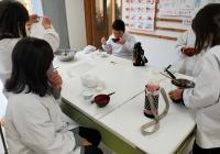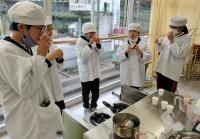 3つの班でそれぞれ、あか味噌、合わせ味噌、麦味噌でお味噌汁を作ったので、食べ比べもしました。また、「こんぶ出汁スープ」「味噌だけスープ」「出汁+味噌スープ」の飲み比べもしました。