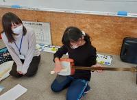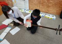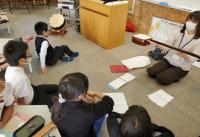 「赤とんぼ」「ミッキーマウスマーチ」などを演奏してもらい、実際に三味線を奏でてもみました。最後は、有名な笑点の音楽を、締太鼓と三味線を合わせました。なかなか触れることのない楽器の一つです。よい体験ができましたね。
