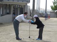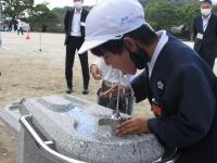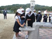 2021年10月18日 15時00分 災害時にできるだけ早く水道水を届けるため、指定避難所である中島小学校に応急給水栓が設置されました。その関係で、本日、松山市長、松山市公営企業局、中島地区地涌防災連合会の方々に来校していただき、応急給水訓練を行いました。