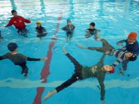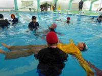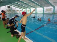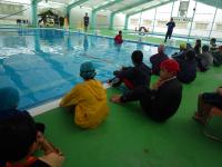 体が重くなり動きにくいですね。気持ちを落ち着かせて、背浮きをしたり、ペットボトルやランドセルを使って体を浮かすこともできるのですね。あってはならないですが、もしものとき、今日の実習を生かして自分の命を守る行動を取りましょう。