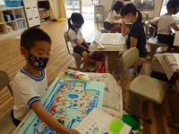 5年生は自分だけのマイホームを描きました。建てる場所から考え、どんな部屋があったらおもしろいかよく話し合いました。「脱・普通」を目指して、オリジナリティ溢れる作品を目指します。