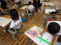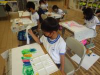 1年生は、自分が乗ってみたいものを想像して絵を描いていました。カマキリや龍など、実際に乗ることができたら楽しい生き物ばかりです。水彩絵の具の使い方も丁寧に学習しました。