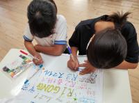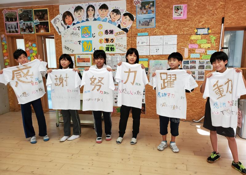 背中の文字は学級目標です。