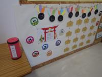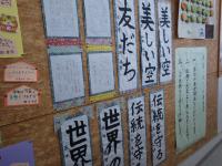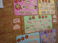 2022年1月19日 15時03分 今日は校内の掲示物の紹介をします。先日、書き初め大会が行われたので、どの教室にも作品が飾られていました。職員室横のスペースには、書き初め大会で入選した子どもたちの作品が飾られています。また、その横には、38名の「今年がんばりたいこと・今年の願い事」が描かれた絵馬もありました。